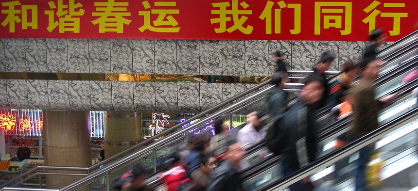 Passengers take moving staircases to waiting halls of a railway station in Zhengzhou, China. Xinhua, Wang Song/AP