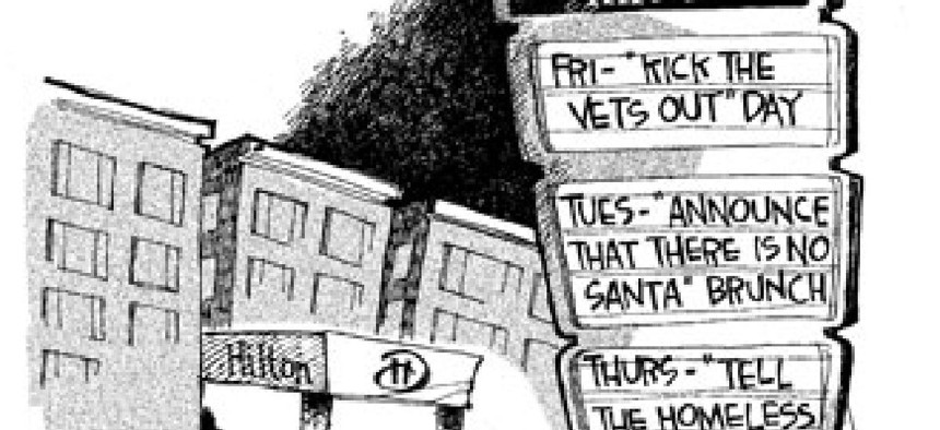 The end has come. April 28 was the final night for those dinners. The Hilton hotel chain decided, rather suddenly, to revoke the restaurant’s lease. The reasons behind that decision remain unclear. Hilton officials have been coy about offering an explanation. The hotel chain has been vilified by veterans in the blogosphere where the rallying cry has become “Operation Perish Hilton.”